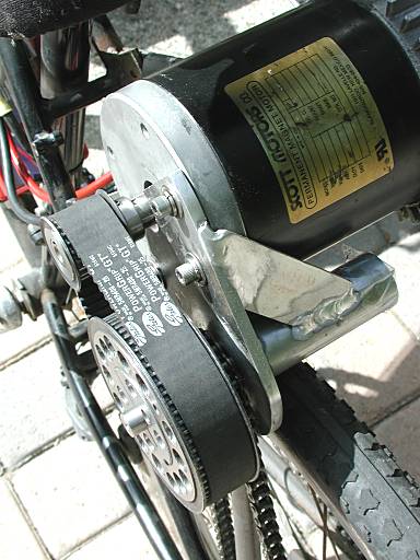 Experienced tinkerers may glean a lot of ideas and solutions from my pages if they want to use them and adapt them. There are parts lists and plenty of photos. This driveline is now extremely robust and probably suitable for larger electric vehicles, not just bikes, up to three to five horsepower. Over the course of this project I've made many interesting discoveries, encountered issues and problems which all electric vehicle builders must face, and finally figured out some fairly simple solutions. I've fitted a number of different driveline systems which range from simple single vee-belts to the present double reduction using a heavy-duty toothed belt and chain. Earlier versions are shown on following pages. This bike performs well, is stone-reliable and nearly silent, and all the major components are available online or at power transmission supply houses. Note that I had to weld and machine key components like the jackshaft mount using ball bearings, and the chain sprocket that clamps on to the spokes at the wheel hub. The right components and design solutions to this project were hard to come by, and I just want to share what I've learned to promote what I consider a pretty amazing form of transportation.